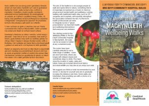 Our third featured Wellbeing Walks leaflet outlines routes that start at Bro Ddyfi Community Hospital. These Wellbeing Walks form part of a series of routes that have been produced by Rural Health and Care Wales and the Greener Aberystwyth Group, starting at health centres. The aim of the Wellbeing Walks are to encourage people to walk and spend time in nature, noting the many positive impacts this has on physical and mental health and wellbeing.